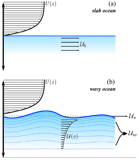 Conceptual diagram highlighting the distinction between defining the relative wind velocity over the (a) slab ocean versus the (b) wavy interface. In the presence of near-surface shear, the relative contributions of viscous skin (Us) and wave form (Uw) must be directly accounted when calculating the relative wind at the base of the sheared wind profile (Figure 30, Ortiz-Suslow et al., 2025).