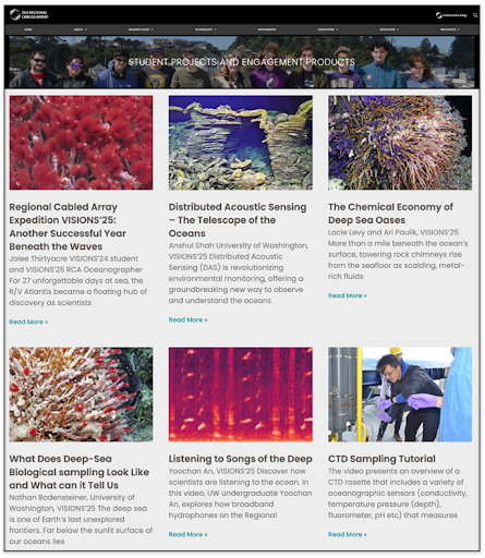 Student outcomes are showcased on Interactiveoceans and span an impressive breadth of scientific inquiry. Recent VISIONS’25 projects include short documentaries demystifying hydrophones and distributed acoustic sensing, genetic analyses of deep-sea organisms, and newly developed technologies to probe the metabolomics of life thriving in the extreme environments of hydrothermal vents. These experiences have translated into numerous senior theses with many students presenting their work at professional scientific conferences.