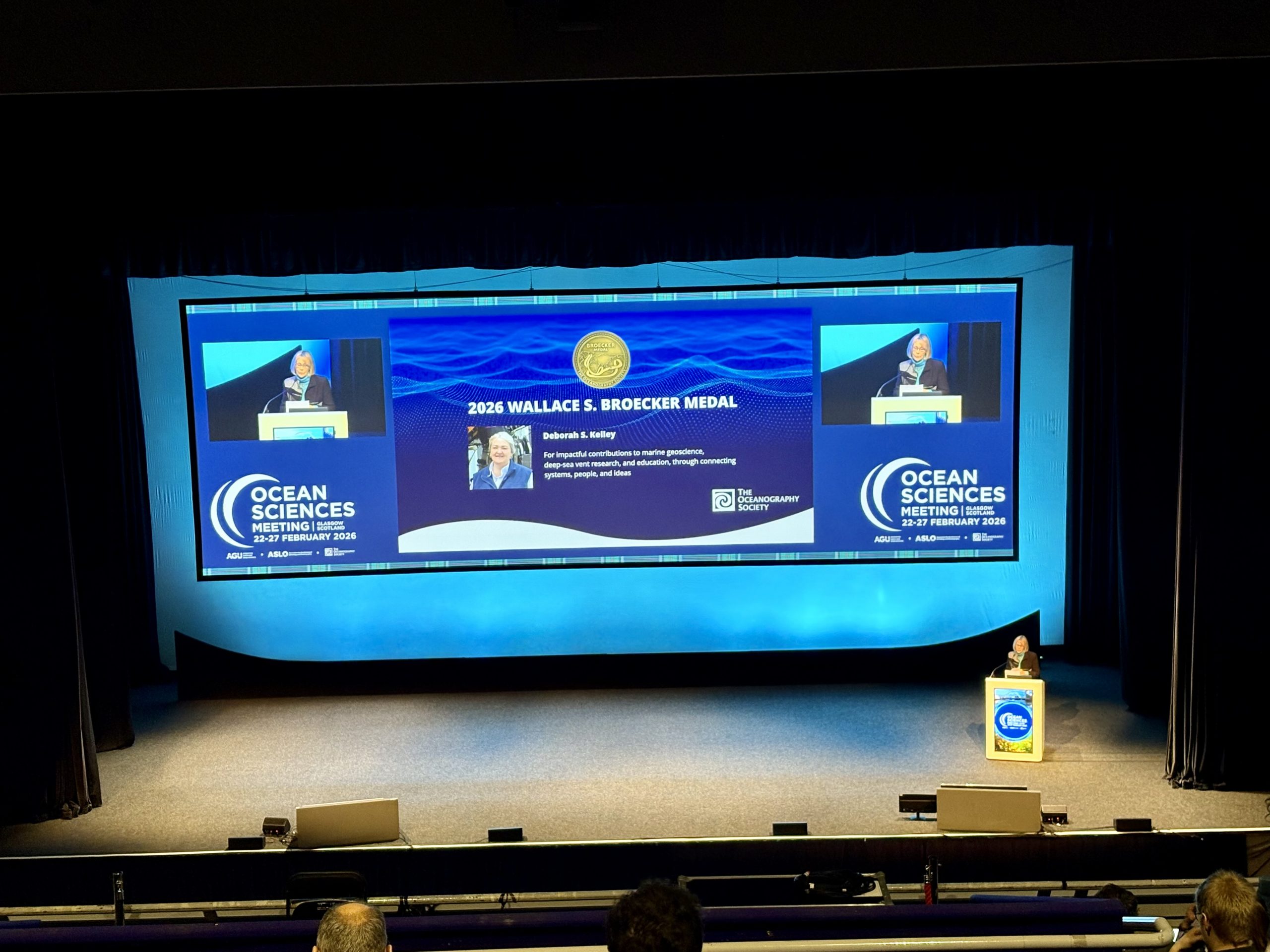 Dr. Deb Kelley, Director of OOI’s Regional Cabled Array, receives the 2026 Wallace S. Broecker Medal at Ocean Sciences 2026.