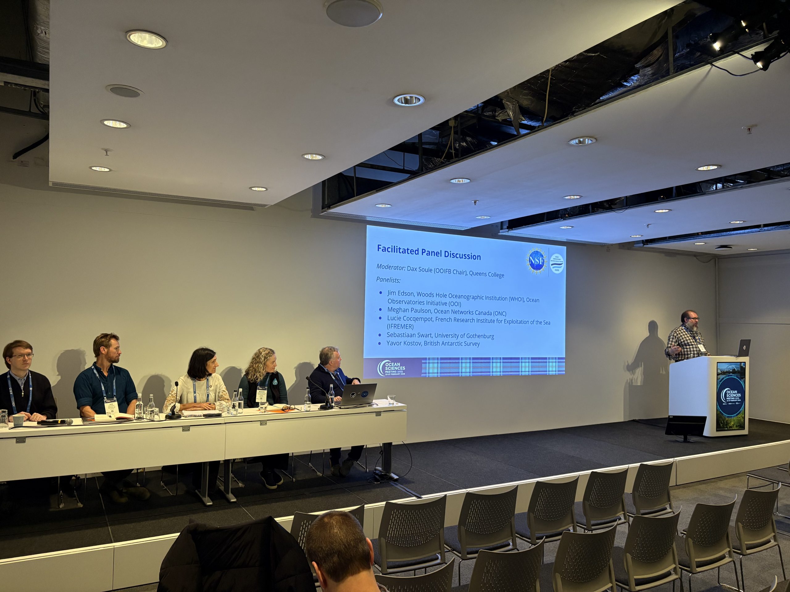 Panel discussion during the OOIFB Town Hall at Ocean Sciences 2026. (c): Amber Coogan, WHOI