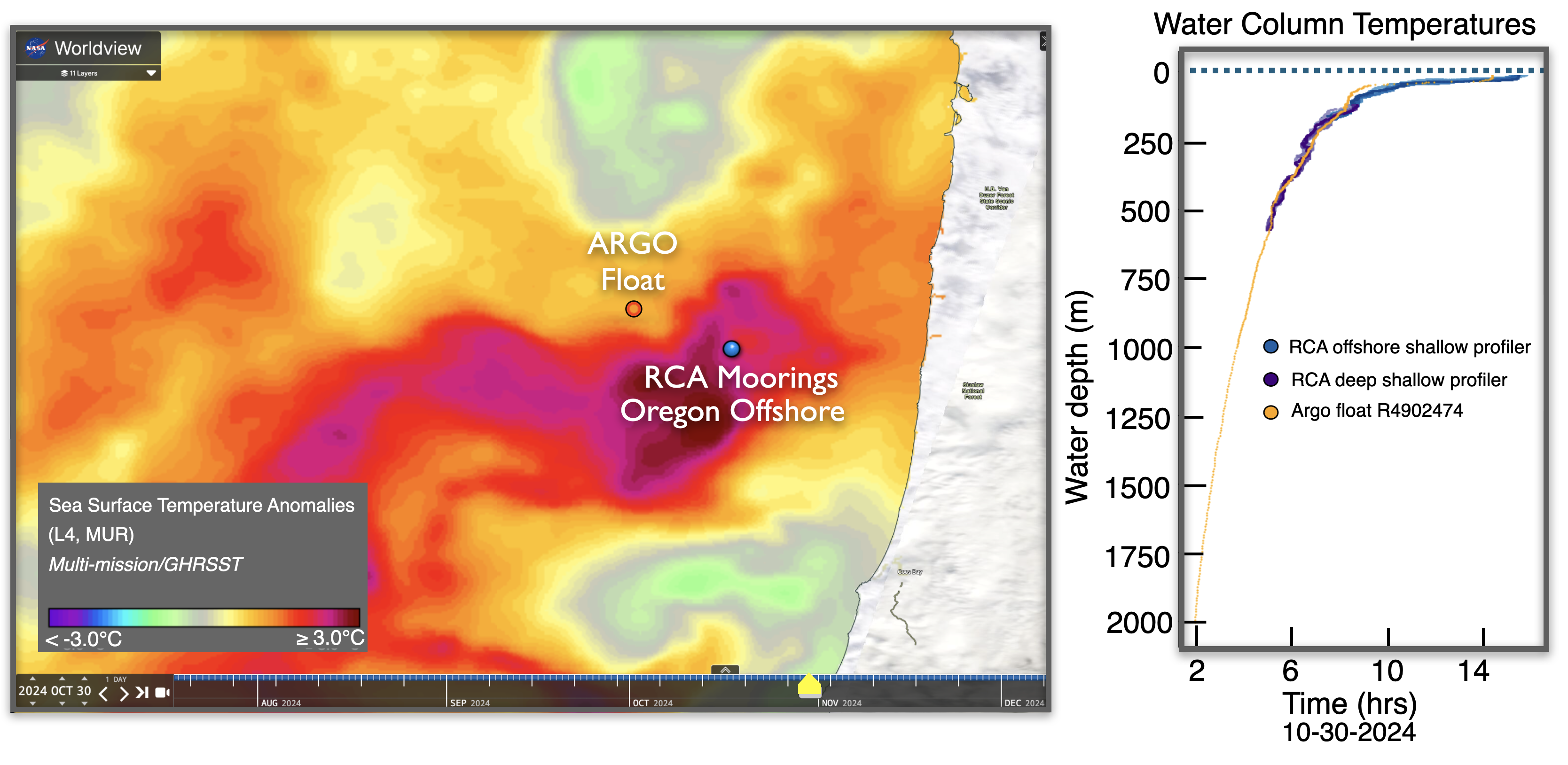 Example illustration of satellite, ARGO Float, and RCA Shallow and Deep Profiler Mooring data to be incorporated into model integration tools aligning RCA observations with model outputs and satellite products. Credit: W. Ruef, University of Washington.
