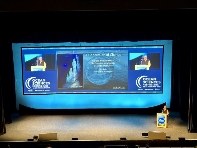 Dr. Deb Kelley, Director of OOI’s Regional Cabled Array, receives the 2026 Wallace S. Broecker Medal at Ocean Sciences 2026.[/caption]