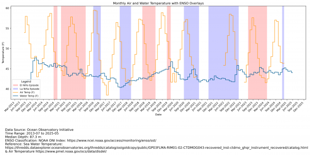 One project focused on connecting large-scale climate phenomena with accessible environmental data. Ejay Aguirre, an undergraduate at the University of Utah, integrated datasets from OOI, Ocean Networks Canada (ONC), and the National Ecological Observatory Network (NEON) to investigate how the El Niño Southern Oscillation (ENSO) is reflected across different monitoring sites. Using Python and Jupyter Notebook, he built a workflow for retrieving, cleaning, and comparing data across infrastructures. The analysis revealed that site characteristics, particularly latitude, influence the visibility of ENSO signals, with higher-latitude sites exhibiting weaker short-term patterns. Future work includes expanding the study to additional sites for broader spatial coverage, incorporating other climate indicators such as the Pacific Decadal Oscillation (PDO) and North Pacific Gyre Oscillation (NPGO), and publishing a publicly accessible, fully documented Jupyter Notebook to support reusability within the research community.