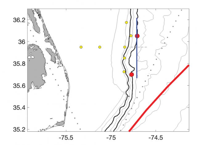The Ocean Observatories Initiative (OOI) Pioneer Array plays an important role in advancing our understanding of the Mid-Atlantic Bight and its dynamic interactions with the Gulf Stream. The Gulf Stream separates from the continental shelf northeast of Cape Hatteras and is found just offshore of the Pioneer MAB Array at its new location east of Nags Head, North Carolina. The Pioneer MAB science drivers include investigation of shelf-slope exchange that may result from Gulf Stream eddies and meanders. In order to capture variability offshore of the shelf, the Pioneer moored array extends offshore, but only to water depths of 300 m to avoid direct interaction with the Gulf Stream.