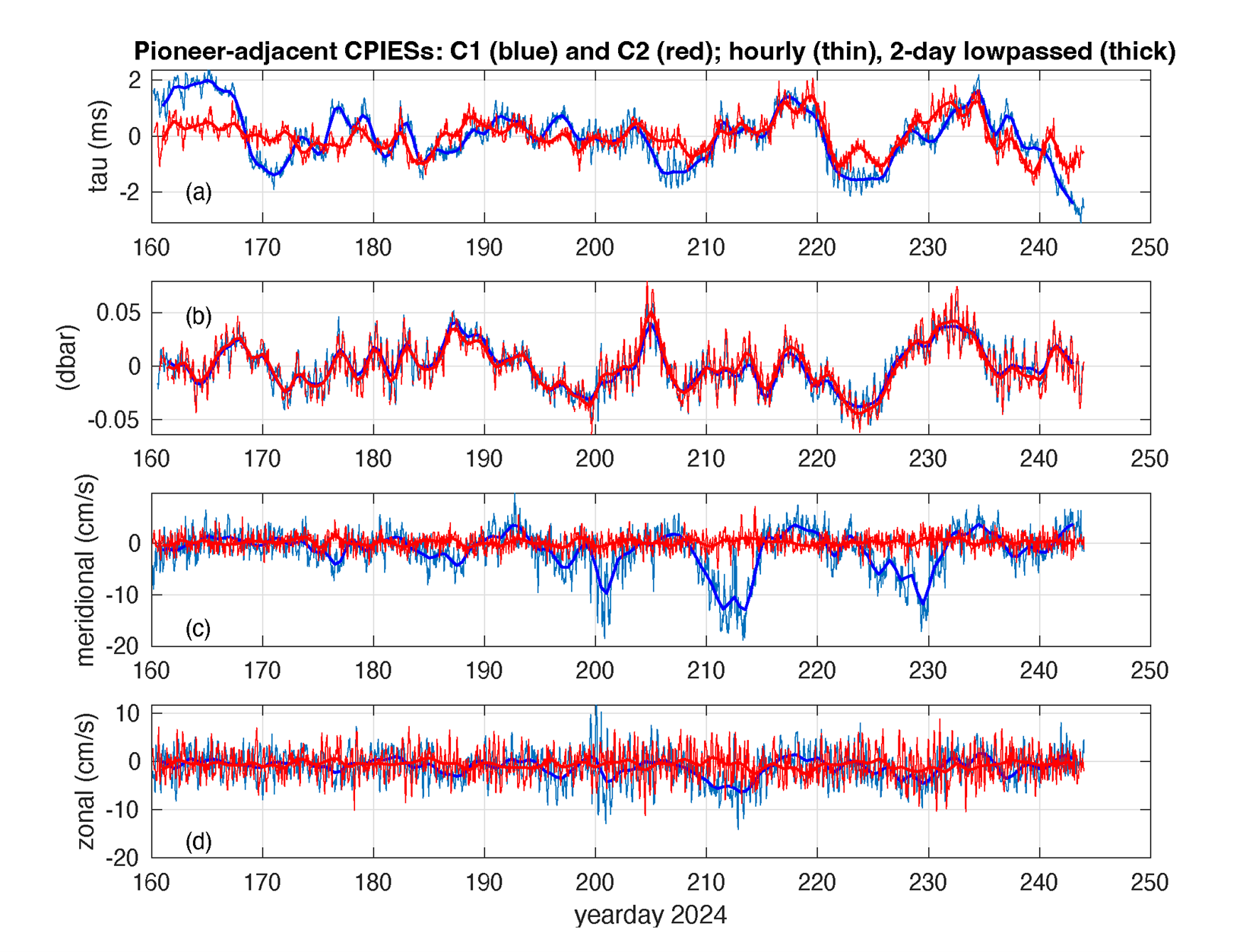 The CPIESs were deployed in June 2024 and will remain on site for four years. They are equipped with Popup Data Shuttles (PDSs) that return batches of data via satellite at regular intervals throughout the deployment. The CPIES measure round-trip vertical acoustic travel time with bursts of 16 pings every 10 minutes, along with near-bottom pressure and current measurements every 30 minutes. Travel time provides information about vertical density structure. Bottom pressure helps to diagnose large-scale barotropic circulation and sea level changes. Near-bottom currents give local flow conditions and help resolve ambiguities between baroclinic and barotropic contributions.