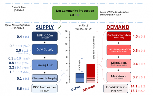 Assessment of the organic carbon budget in the upper mesopelagic zone during EXPORTS. Estimated individual contributions to supply (left) and demand (right) are provided along with error estimates. Terms with multiple measurement methods (far left, far right) were averaged. The center panel shows the cumulative supply and demand relative to a vertical scale in units of mmol C per (m^2 day). From Stephens et al., 2025.[/caption]