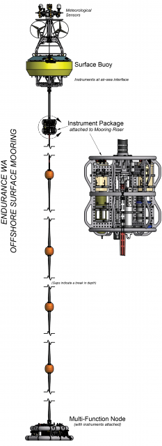 Like other coastal moorings, the Coastal Endurance Washington Offshore Surface Mooring is specifically designed to examine coastal-scale phenomena and withstand the challenging conditions of shallow coastal environments, including large tidal fluctuations. The Surface Mooring contains instruments attached to a Surface Buoy floating on the sea surface, Near Surface Instrument Frame 7 meters below the surface, and a Seafloor Multi-Function Node (MFN) located on the seafloor. The Surface Buoy provides a platform on which to secure surface instruments above the sea surface, below the sea surface, and across the interface between. Additionally the Surface Buoy contains an antenna to transmit data to shore via satellite.