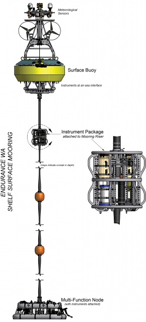 The Coastal Endurance Washington Shelf Surface Mooring is located on the Continental Shelf, approximately 90 meters deep. The Continental Shelf-Slope area off the Washington coast is a highly productive, dynamic upwelling environment.