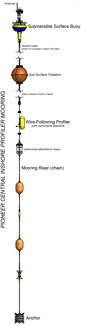 [box type="note"]In the fall of 2015, deployments of the Coastal Surface Piercing Profiler (CSPP) Moorings at the Pioneer NES Array were suspended. In the spring of 2016 the Program approved the use of Coastal Profiling Gliders in the summer and Profiler Moorings in the winter at the sites previously occupied by CSPPs.[/box]The Pioneer NES Inshore Surface Piercing Profiler Mooring is located on the inner Continental Shelf, approximately 90 meters deep. The Continental Shelf-Slope area off the New England coast is a highly productive area and one that is located at a dynamic intersection where ocean currents meet in weather-like “fronts,” and where nutrients, pollutants, and other properties are exchanged between the coast and the deep ocean. Data from the inshore, shelf area help to examine exchanges between the shelf and slope and the shelf ecosystem, as well as provide broader insight into the issues of air-sea gas exchange, including Carbon Dioxide.