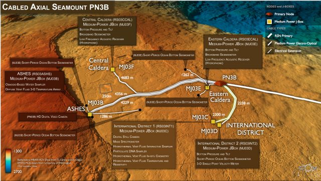 Seafloor instruments at Eastern Caldera are attached to a Medium-Power J-Box (MJ03E) through a series of extension cables. A 635 m long extension cable from Primary Node PN3B provides the JBox with significant power (375 v) and bandwidth (1 Gbs) to operate the instruments and transmit data to shore.