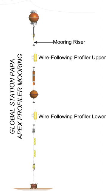 Like other Apex Profiler Moorings, the Station Papa Apex Profiler Mooring contains two Wire-Following Profilers that house instrumentation. The Wire-Following Profiler moves through the water column along the mooring riser, continuously sampling ocean characteristics at a high vertical resolution over a specified depth interval (156-2090 meters and 2129-4063 meters deep).